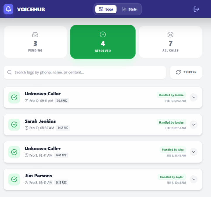 A simple web app that turns voicemail chaos into a clear, shared inbox so teams always know which customer calls have been handled and which still need attention.